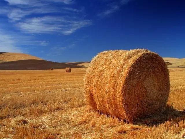 黄了的牧草已经收割下来,打成半人高的结实草捆,错落有致地散布在山腰坡间,黄酥酥,圆滚滚,好像地毯上和谐立体的图案,是秋季草原才特有的亮丽风景。割过的黄草会短暂返青......