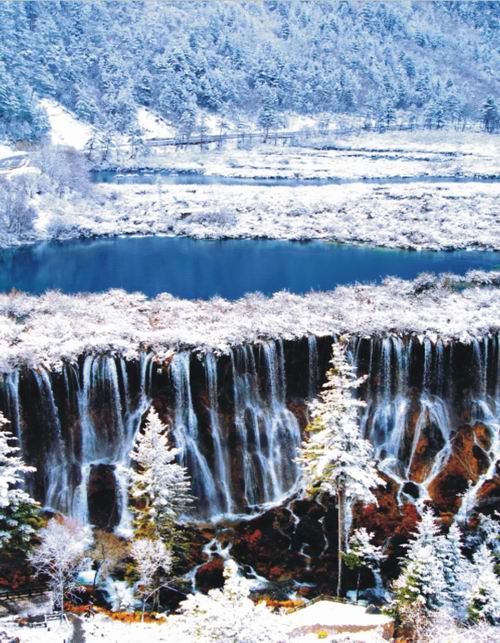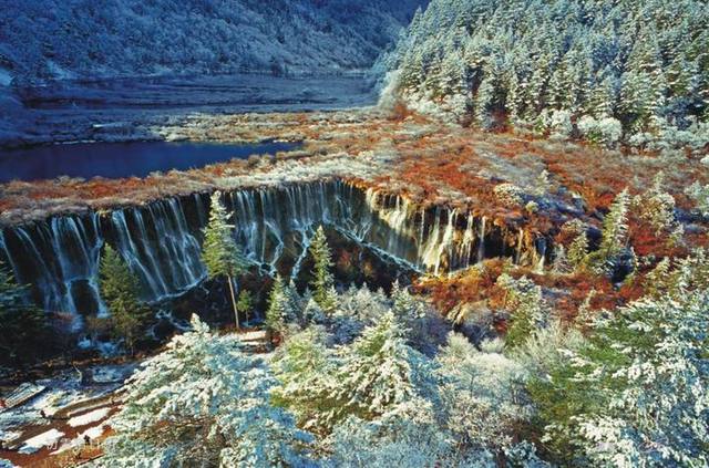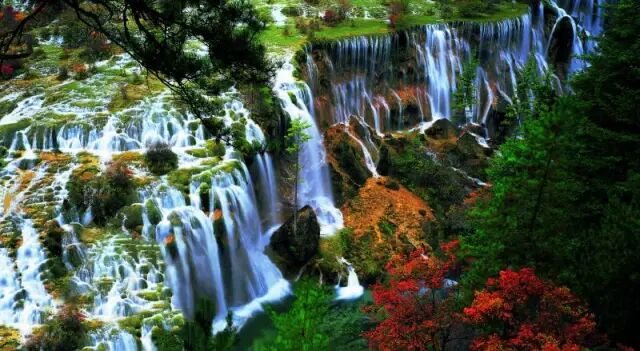诺日朗瀑布位于九寨沟内三条沟的交汇处,海拔2365米,瀑宽270米,高24.5米,是中国大型钙化瀑布之一,也是中国最宽的瀑布。