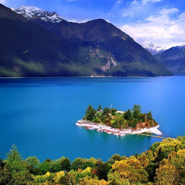 漫步在巴松措湖边,仿佛置身于斑斓的彩林,隔岸望去,皑皑雪山就矗立在天边。蓝天、白雪、彩林、湖泊在眼前交相辉映。