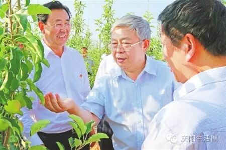 7月5日,国务院扶贫办主任刘永富(中)在宁县产业扶贫现代农业示范区调研“海升”模式苹果栽植情况。