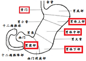 肿瘤可以长在如上图中胃的任何位置。但相比之下它最喜欢长在胃窦这儿,在胃窦发生肿瘤的患者能够占到40%。