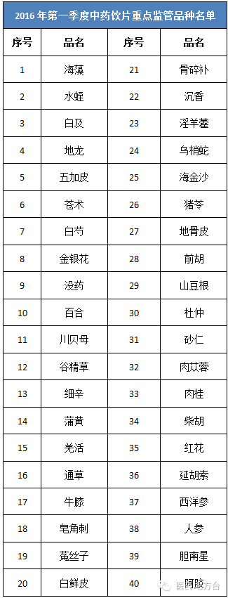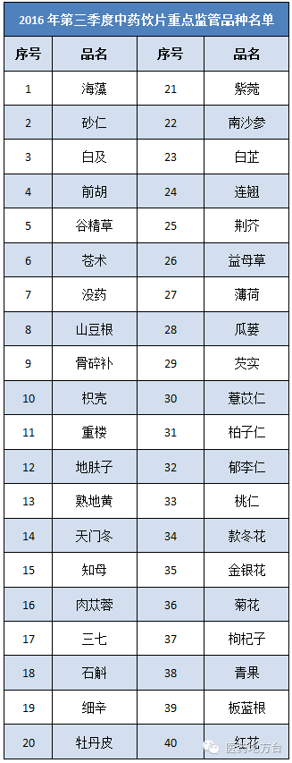 2016年7月至9月,甘肃省相关部门在进行监督检查的同时,将对海藻、砂仁、白及等40种中药饮片进行重点检查。。