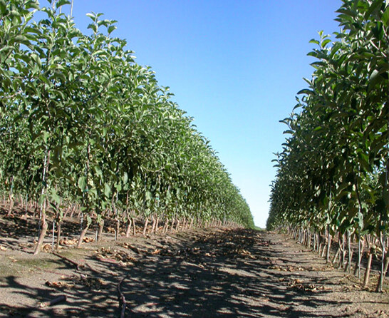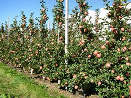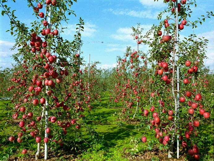 拥有宽宽的行间、各种现代化的管理机械穿行其中,果树一个紧挨一个站着整体的队伍,这是新一代果园的一个显著特征,有些人认为这种管理更类似于工厂的流水线,还有些人喜欢把这种模式叫"结果墙"。这种栽培模式不再像传统果园那样"你挤我、我挤你"的纷乱繁杂,更好的实现了果树、人、土壤、机械、草的和谐共处。一排一排的,管理起来也很方便,类似于工厂里的流水线作业,而无需像传统果园管理那样围着果树转圈、爬到树下、钻入树里、上到树顶。