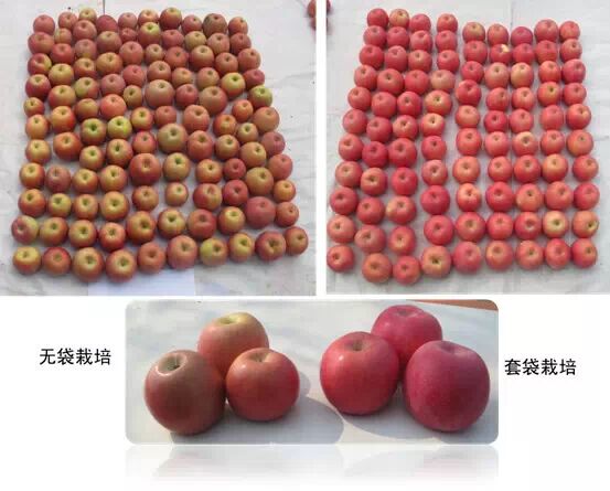 对于苹果品质来说,套袋苹果除了外观品质(果面光洁度、着色)较无袋栽培苹果好以外,内在品质许多方面均差于后者,据我们实际调查,套袋苹果的平均糖度比无袋苹果低1.39度。
