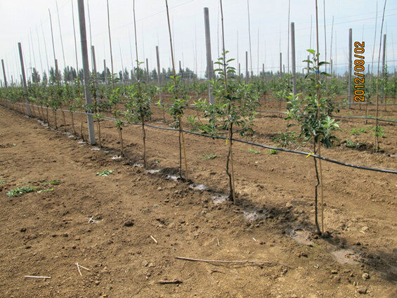 2013年,我们在乾县铁佛基地的当年定植的幼树采用这种肥水供应模式,全年滴灌11次,每亩地每次浇水量2-3方,使用液体肥4-5公斤,取得了很好的效果。一年生树,高度达到2.0米左右,干径达到2公分,一些果树有十几个分枝,部分果树形成短枝并成花,果树生长量是传统管理的130%-150%。