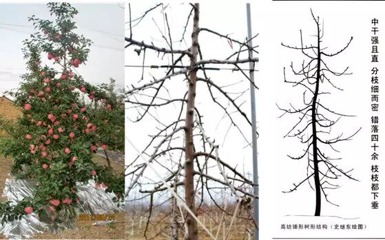 高纺锤形整体树形呈高细纺锤形状或者圆柱状,成形后树冠冠幅小而细高,平均冠幅1-1.5米,树高3.5~4.0米,主干高0.8~0.9米;,结果枝直接着生在小主枝上,小主枝平均长度为0.5-0.8米,,同侧小主枝上下间距约为20公分。,成形后高纺锤形的苹果树在秋季的亩留枝量8-12万条,长、中、短枝比例1∶1∶8。