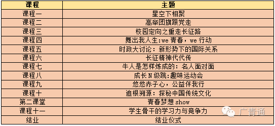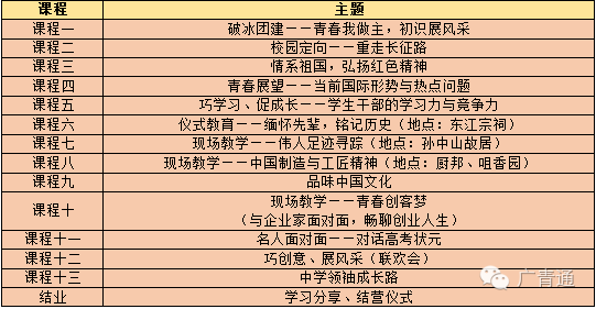 悄悄告诉告诉你,广东省中学生骨干训练营今日起正在来袭...青年最富有朝气、最富有梦想,青年兴则国家兴,青年强则国家强。广大青年要坚定理想信念,练就过硬本领,勇于创新创造,矢志艰苦奋斗,锤炼高尚品格,在实现中国梦的生动实践中放飞青春梦想,在为人民利益的不懈奋斗中书写人生华章。2016年是特殊的一年。80年前,一群英雄越过山高林密的康藏区、挺进人迹罕至的夹雪山、行走在被人称为“死亡谷”和“鬼门关”的大沙漠。长征路上荆棘遍地,破碎河山满目疮痍。终于在1936年,生死绝境中进行战略大转移的红军三大主力在甘肃会宁会师,宣告了红军两万五千里长征胜利,锻造了不畏艰险、勇往直前的长征精神。为深入贯彻落实中央党的群团工作会议精神,加强中学生思想引领,大力培育和弘扬长征精神,深化中学生骨干培养,团省委决定举办2016年广东省中学生骨干训练营暨纪念红军长征胜利80周年。 少年强则中国强,敢于有梦敢于追梦的青年是祖国的未来。通过名人面对面,榜样的力量,扬起理想的风帆。 这里汇集了广东省中学生骨干,五天四夜的朝夕相处会让你结识来自省内各地的优秀中学 学生们离开父母的庇佑学习集体生活,通过走访、调研等活动体验风土人情,了解异域他乡的生活形态。参观红色基地,领略红色精神,以弘扬长征精神为主题进行理想信念教育,通过“遵义会议”、“飞夺泸定桥”、“爬草地翻雪山”等特色定向活动,让学生们更加了解长征历史,弘扬长征精神,培养爱国主义情怀。 文化是一个城市的名片,训练营特意安排了城市文化探索之旅,感受文化正能量。 训练营以团队形式开展,在团队活动中锻炼学生的领导力和执行力,提高相互学习和与人相处的能力。、三河坝、青溪镇等革命纪念园等红色革命历史为主线,,聆听在中国领导下老区人民用鲜血和生命谱写的可歌可泣的动人故事;同时通过生活体验、社会调研认识岭南文化三大支柱之一的客家文化,增强对中国传统文化的认识,在体验活动中提升团学干部的执行力和竞争力。探访孙中山故居,在东江纵队司令部旧址进行仪式教育;参访中山特色企业,培养创业创新意识,体验中华传统手工工艺;参与素质拓展训练,提升学生干部的领导力、学习力。以体验式、参与式、互动式、情景式、案例式教学为主,包括理想信念教育、品德教育、中国传统文化教育、学习力、领导力、创新意识、动手能力、国际视野等内容。 注:课程安排根据具体情况进行微调,具体日程以实际通知为准。