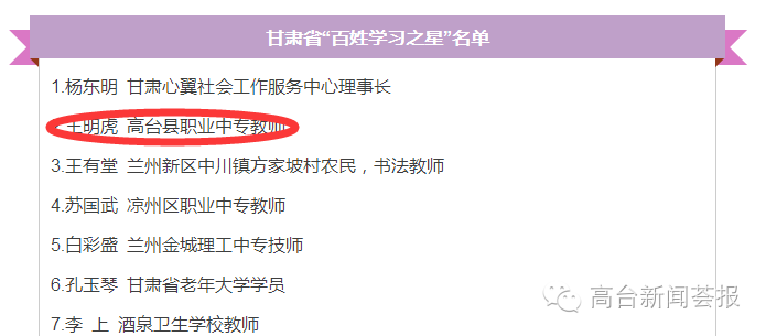 昨天,甘肃省教育厅公示了15名拟被评为2016年甘肃省“百姓学习之星”的人员名单,我县职业中专教师王明虎获此殊荣。