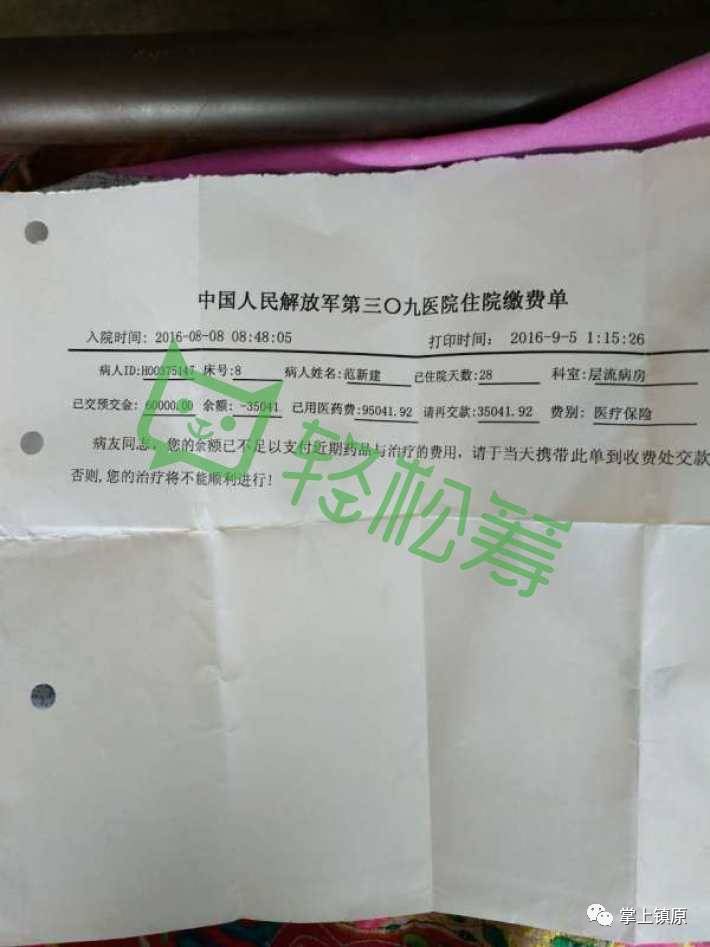 再过三天就是亲人享受天伦之乐的中秋佳节 , 这对大多数人来说再正常不过的团圆之夜 , 而这一切对于我来说简直不敢奢想 , 我老公五月底因急性白血病入住解放军309医院, 目前经过第三次化疗后合并肺炎感染治疗后 , 已用光家庭所有积蓄 , 借遍亲戚朋友再无借钱之处 , 目前已欠医院六万左右医疗费。 医院通知再没有钱交上就会面临停医停药的境地 。