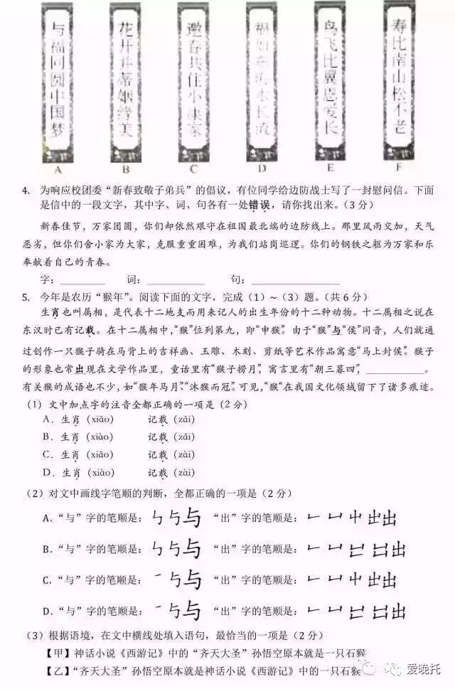 一起来看一看近几年出现在中高考试卷中和书法有关等试题: