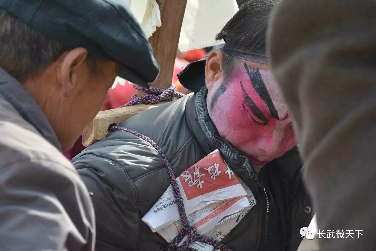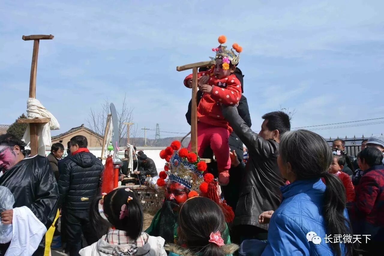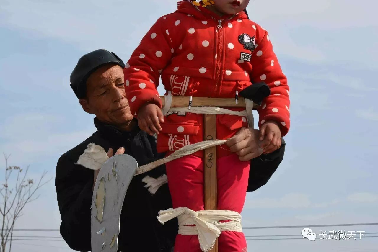 武家沟背芯选精壮成人用专用的木质“背架”背载3—5岁小孩,作高空表演,穿着彩衣、化妆脸谱、上下二人固为一体。
