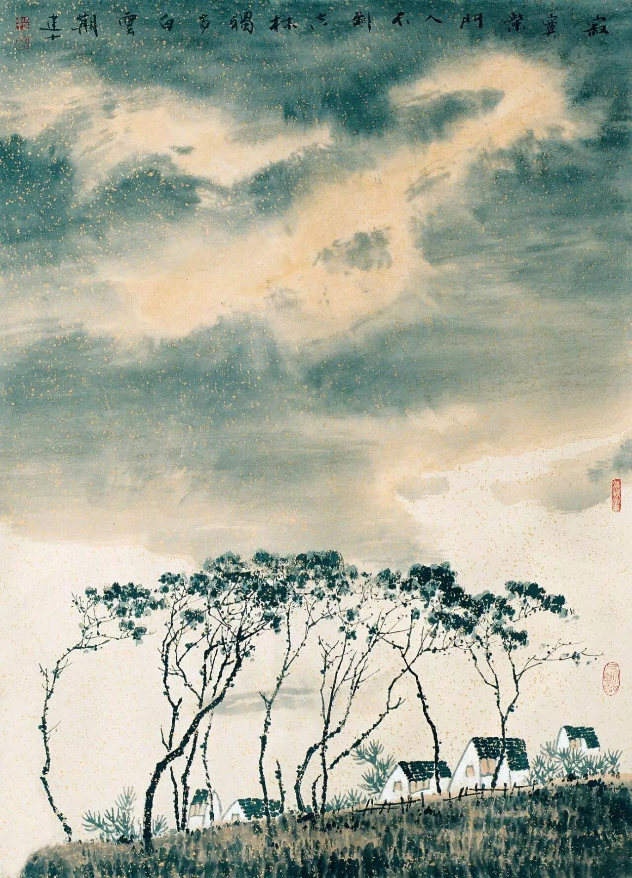 喻建十老师用的洒金纸是一种仿古色的半生半熟的黄洒金。半生熟宣纸遇水慢慢化开,既有墨韵变化,又不过分渗透,皴、擦、点、染都易掌握,可以表现丰富的笔情墨趣。虽说洒金这种外在的视觉效果对营造画面氛围有着一定的帮助,但仅凭此就想达到浑然天成的艺术境界,还是洗洗睡了吧……毕竟,作品与作者的意境的呈现,最终还是要落实到笔墨语言自身的表现力和感染力上。纵然当下的洒金技艺早已今非昔比,但相较于一般的宣纸,洒金纸面本身还是脆弱的。为防止损坏金笺的表面,一般不作过多地涂抹和洗刷,要求创作者下笔要心中有数,少做修饰。另外,中国山水画自古以来就极其注意色彩的搭配和章法布局。从喻建十老师的山水画中我们可以看到,画面以纸张原本的暖色调为主,巧妙地辅以少量的冷色调,形成了一定的对比关系。此外,画面中各个主体元素之间位置经营准确,有虚有实。整个画面于富贵之中却又得以脱俗,显现出一份诗情与雅意。▍