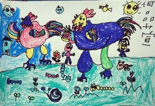 很快,小蛐蛐的叫唤传到大公鸡的耳朵里,大公鸡感到莫名其妙,小蛐蛐说的学公鸡学公鸡,到底在学什么呢?他整了整鸡冠,披上帅气的羽毛大衣,昂首挺胸出门来找小蛐蛐。小蛐蛐看见自己的偶像朝自己走来,站在石头上,更加