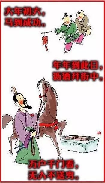 初五刚把财神迎进门,初六就要送走穷神。送穷神这一天,要在家里面进行大扫除,扫出来的垃圾,还有没用的破衣服等等要全部扔掉。此外,还要喝一种素菜汤,这种汤是用菠菜、青菜等七种蔬菜做成的。