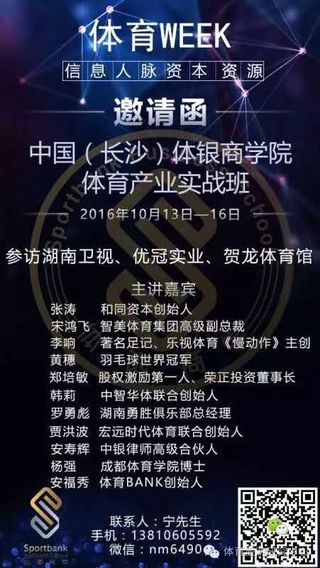 杨强博士受国内知名体育自媒体平台"体育BANK"及其体银商学院的邀请,将于10月13日-16日在长沙举行的体银商学院体育产业实战高端闭门研讨会(第一期)上担任授课导师,讲授体育旅游专题课程。