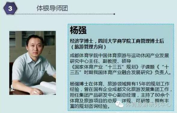 杨强博士在体育、旅游领域拥有15年的规划工作经验,为国家社科基金“体育产业与相关产业融合发展研究”负责人、《国家体育产业“十三五”规划》子课题负责人、国际旅游投资协会学术顾问委员会执行委员、四川省休闲运动科学管理学会理事。近两年为四川、云南、重庆、甘肃、江苏等国内十余个地方政府与企业主持编制体育旅游、体育产业、体育赛事方面的规划,拥有丰富的规划主持经验。