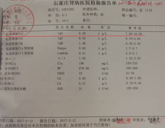 刚入院,发现小刘肿的特别厉害,眼睛肿的眯成了一条缝,腿上是一按一个坑。检查蛋白4+、潜血2+,24小时尿蛋白定量达到了13.87g,这个蛋白量已经是非常高了。不仅这样,他身体的免疫力还特别低,免疫球蛋白只有0.49g。