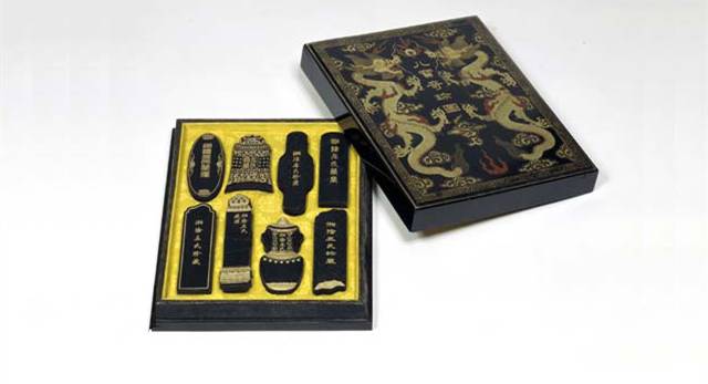 这套“清胡开文八宝奇珍墨”原本是宫廷御用,是清宫旧藏。现在被收藏在故宫博物院里。这套墨墨质黑黝坚润,做工非常细腻。8锭墨被装在一绘有黑漆描金彩色双龙戏珠图的盒子里,“八宝奇珍图”五个字。