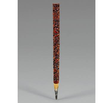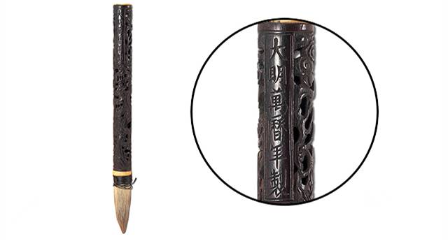 近几年来,文房用品在艺术品拍卖市场上可谓是风光无限,它们频频创下天价。这支紫檀镂雕龙凤毛笔,笔上刻有“大明万历年制”六个字,为楷书款。笔杆是紫檀木,通体刀法深刻细腻。笔首尾镶有象牙,更显得气质不凡。这支笔拍出了40.32万高价。