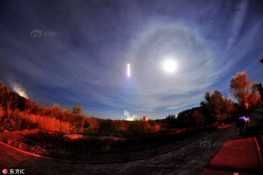9月15日晚10点04分,八月十五中秋节夜晚,甘肃酒泉,天宫二号飞行器发射升空。在酒泉卫星发射中心,一轮满月周围惊现一圈月晕,这为即将升空的火箭背景加分不少