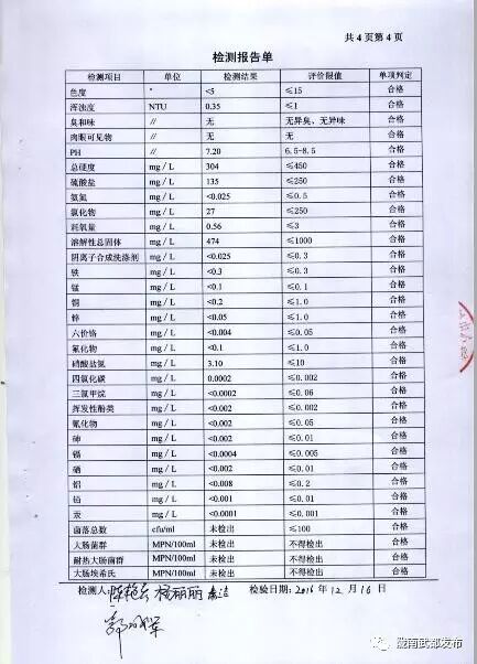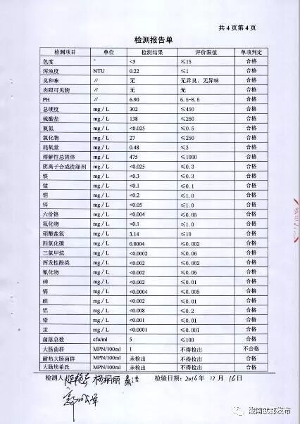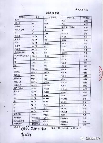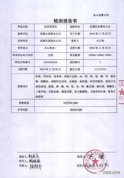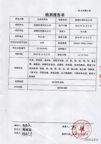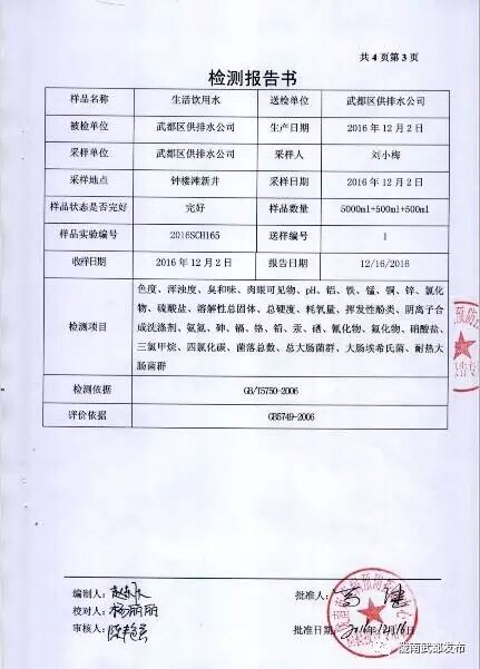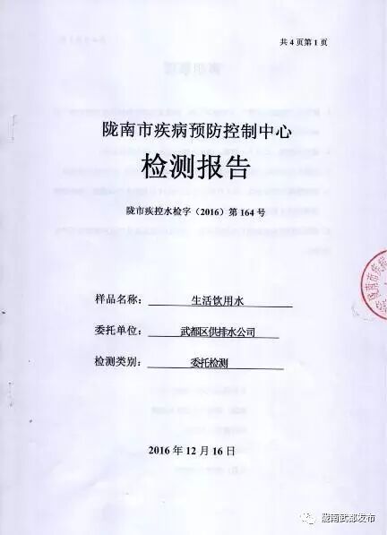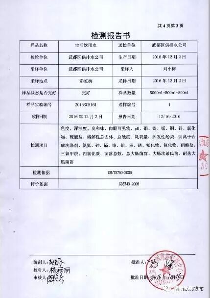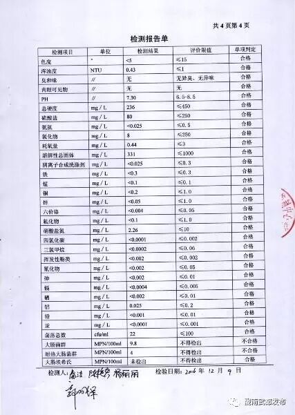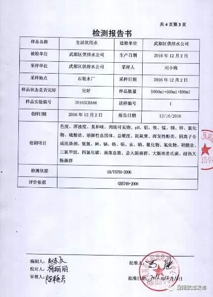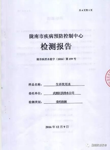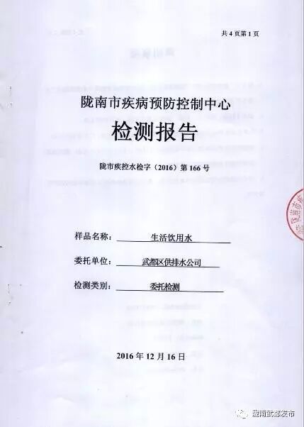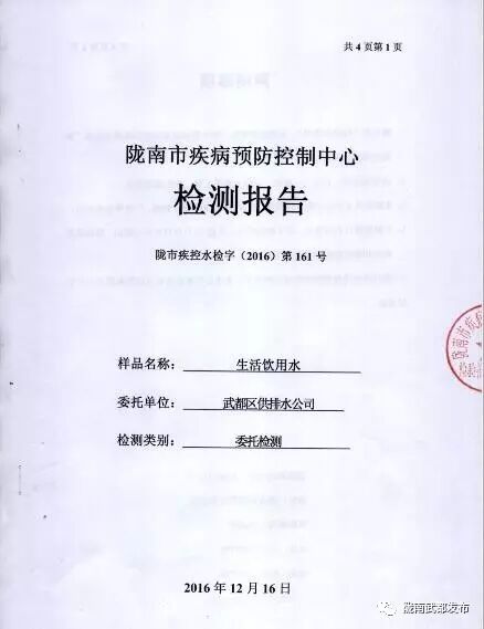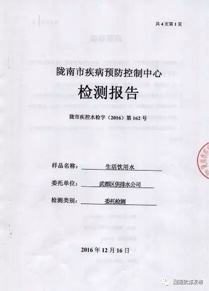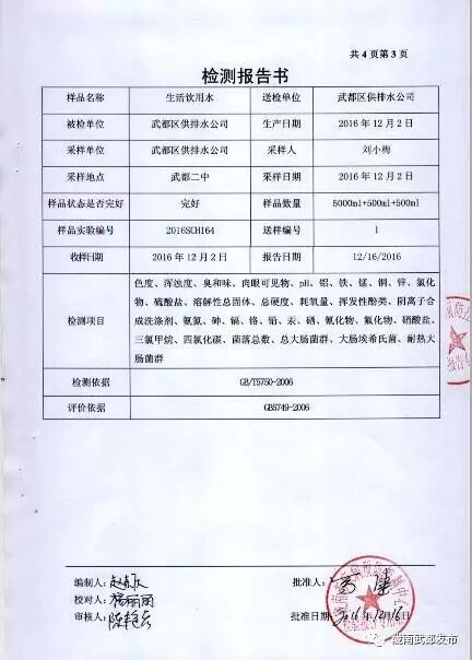 为了让市民对所饮用的市政自来水水质有所了解,使市民饮用到放心水,武都区自来水公司选定了7处地段,对市政自来水做了抽样化验,所抽检的样本化验结果全部符合GB5749—2006生活饮用水水质标准,现将抽验结果予以公布。