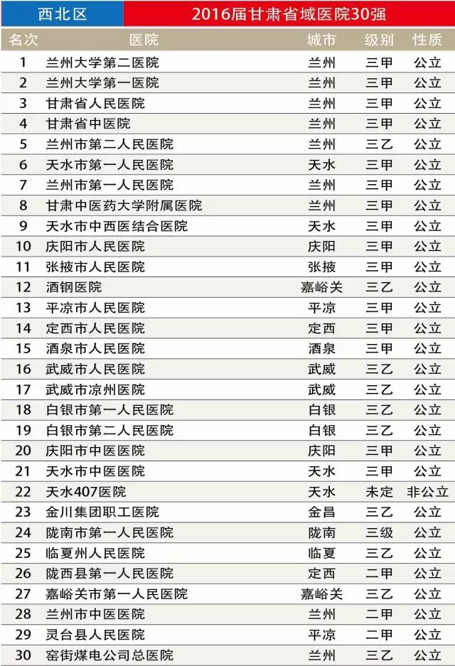 重磅丨甘肃省2017年医院30强排行榜出炉!其中武威就有两家!