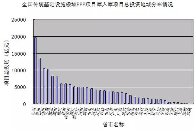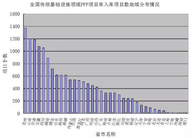地方政府借债“搞政绩”行不通了,目前在重大基础设施建设等大型项目的资金问题上,地方政府更多采用PPP模式。根据发改委最新公布的PPP项目库中看,东部地区项目3222个、总投资34584亿元;中部地区项目4970个、总投资48314亿元;西部地区项目7774个、总投资75857亿元。贵州省、云南省、甘肃省、安徽省、四川省入库项目个数居全国前五位,分别为1376个、1202个、1186个、1078个、1055个;云南省、贵州省、四川省、安徽省、湖北省入库项目总投资位居全国前五位,分别为19699亿元、13707亿元、10482亿元、10213亿元、8224亿元。