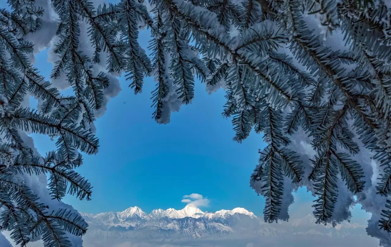 大雪覆盖的松树正好将远方的贡嘎框在了画中