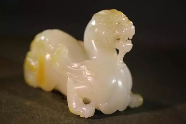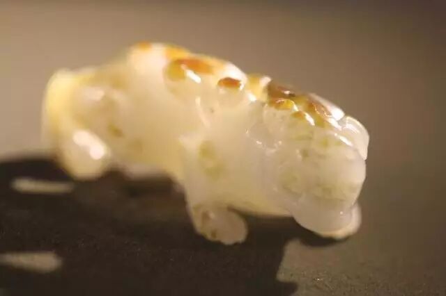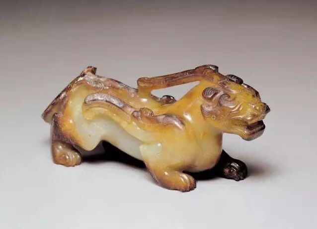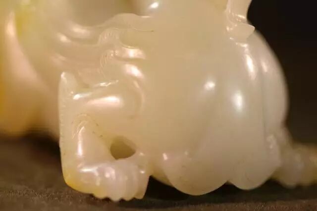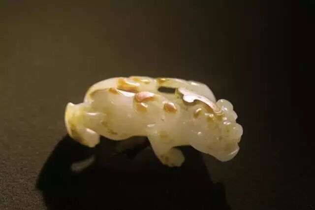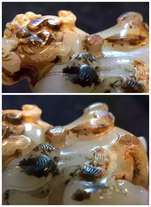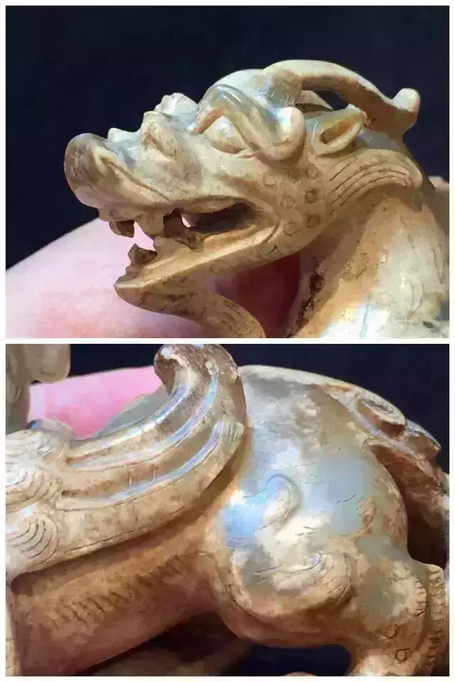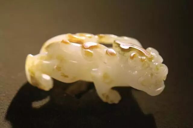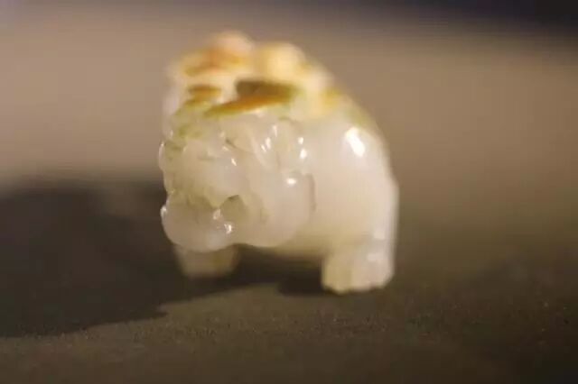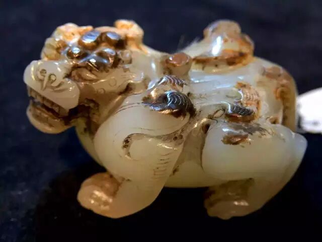 因曾受沁熟盘,甚至被染色,所以表面多有深浅褐斑。这是目前所知的汉代玉辟邪中,体积较大的一件。