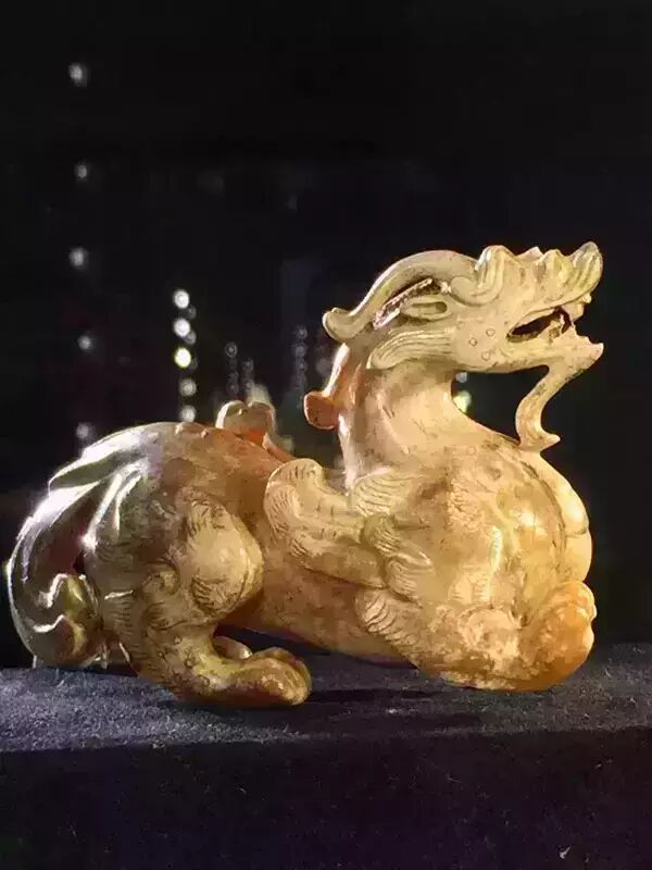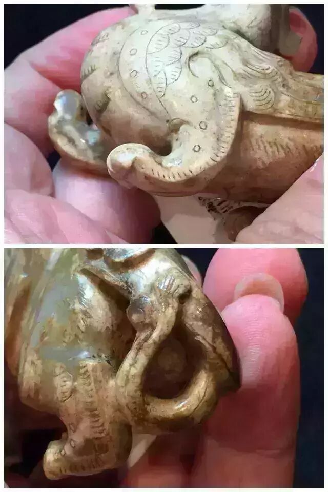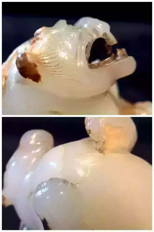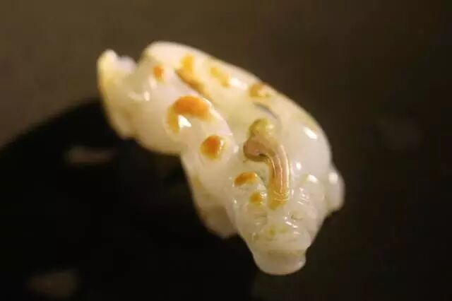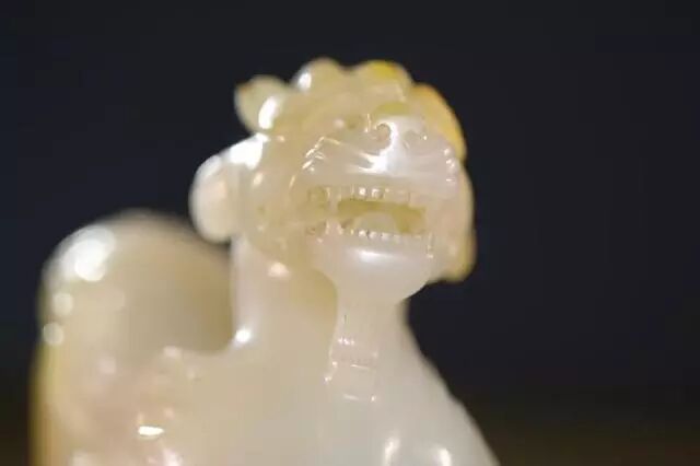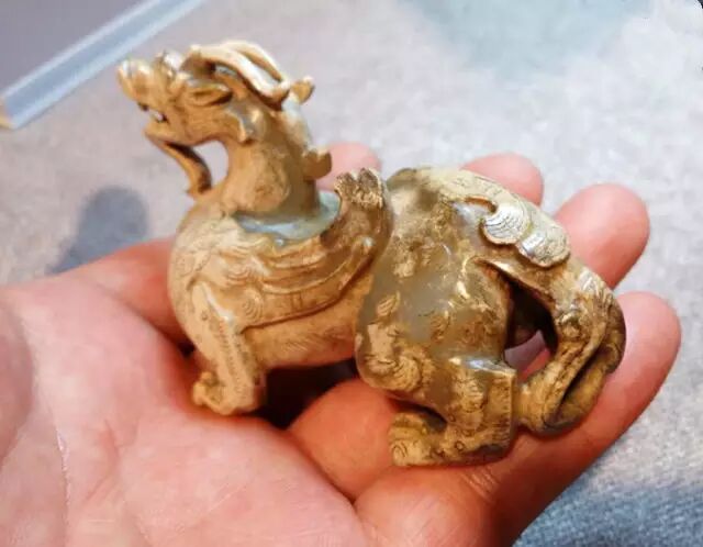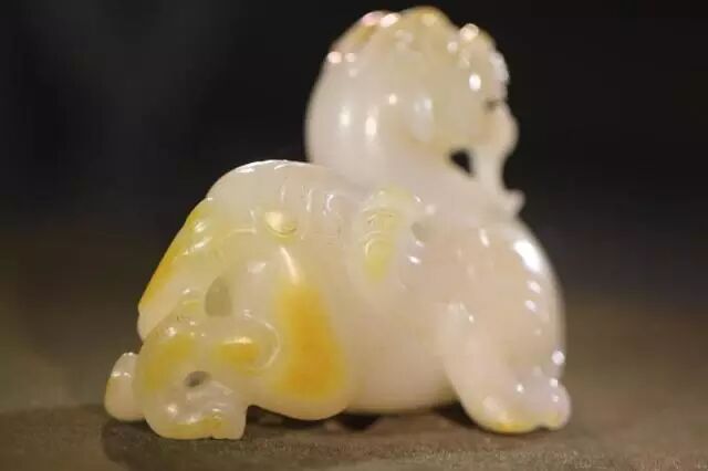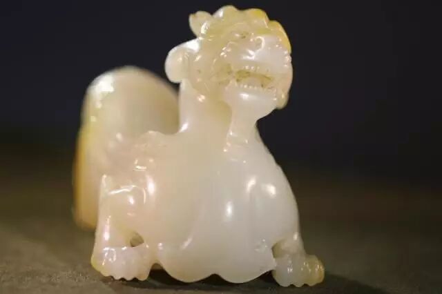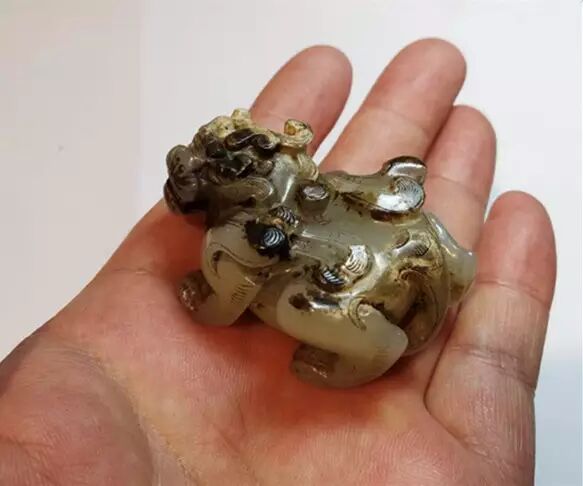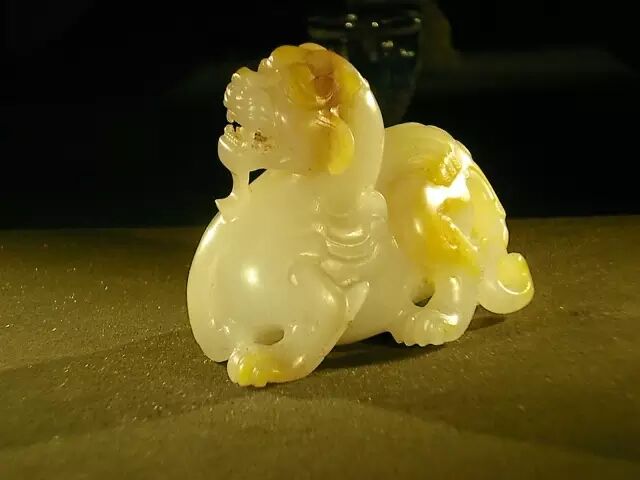 因曾受沁熟盘,甚至被染色,所以表面多有深浅褐斑。这是目前所知的汉代玉辟邪中,体积较大的一件。