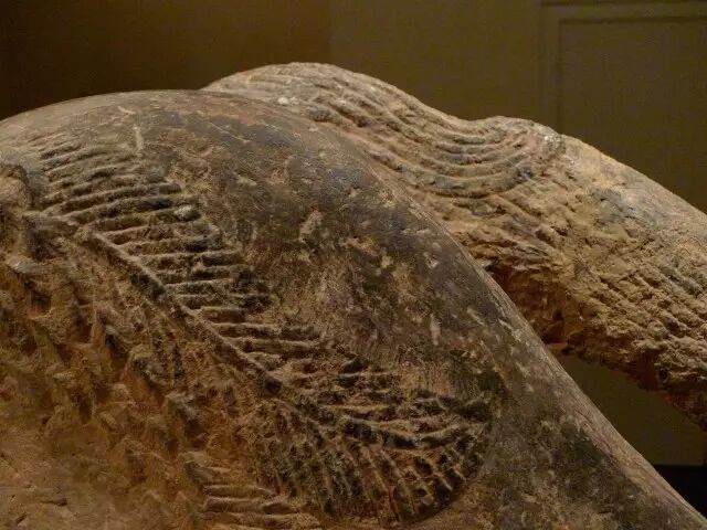 邪肩生双翼,翼羽层层叠压,后腿上也雕有羽毛。