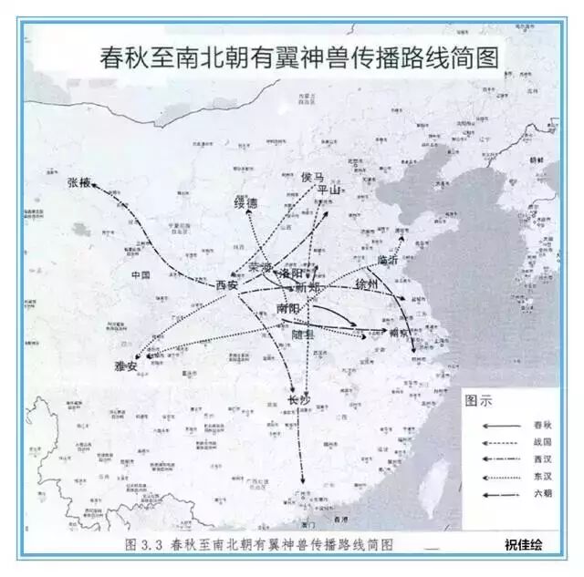 此外,中国的有翼神兽不仅在北方流行,在长江流域和长江以南也有不少发现,东可及于江苏、浙江,南可及于两广、云南,西可至于四川。它们当中,有些年代还很早,可以早到战国早期,说明古代的传播与交流远比想象要发达。其传播路线,除与古代丝路有关的东西通道值得重视,还有很多南北通道也值得考虑。