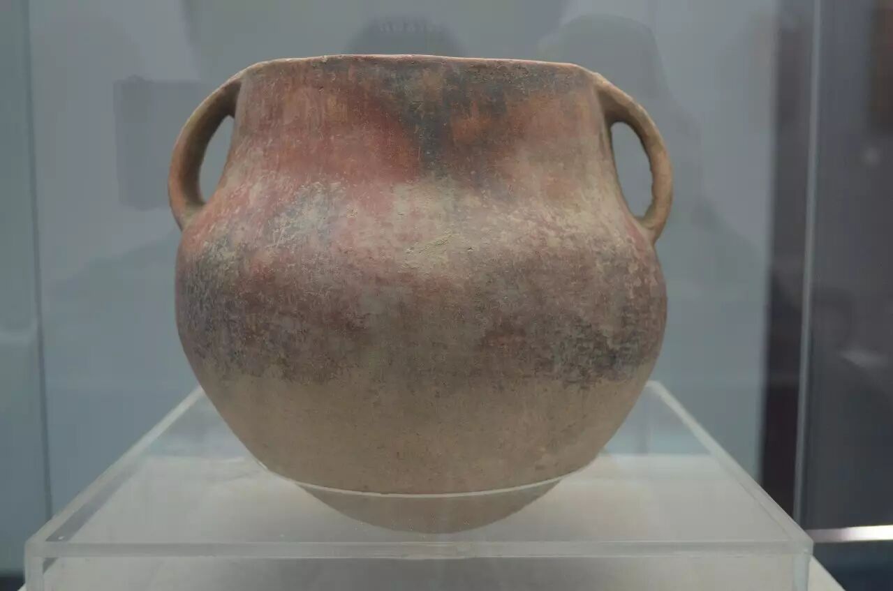 高20厘米,口径14.6,腹径20.6,重1.06kg,双耳,圜底,肩部以上施红彩。现藏于金川区博物馆。