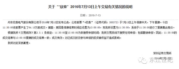 深交所:*欣泰停牌结束时间被误设为11点半 但成交有效