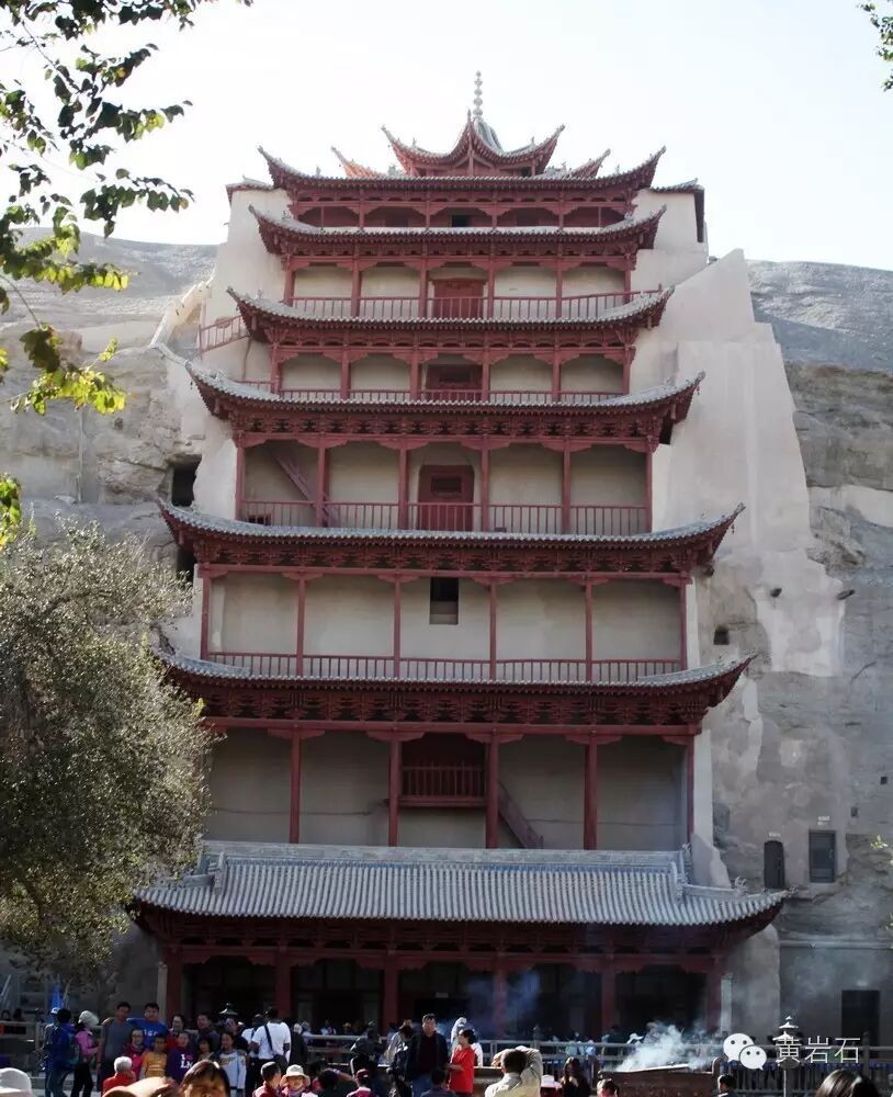 莫高窟九层楼洞窟此窟开凿于初唐,因其共有九层而得名,它攒尖高耸,檐牙错落,铁马叮咚,已成为莫高窟的标志之一。同时,敦煌研究院承建了敦煌艺术陈列中心,仿制了部分原大洞窟,使游客在莫高窟的观赏内容更加丰富多彩。