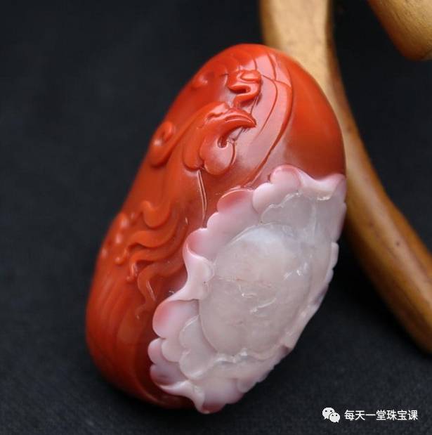 红玛瑙和白玛瑙混合在一起的矿料,虽然混在一起,但是泾渭分明,两种色彩能明显区分开来,适合做雕件。