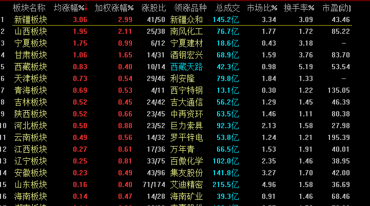 今天2月10日,以新疆为首的西部地区板块得到市场资金的认可,不断涌入 基建,建材,水泥,玻璃行业,带有丝绸之路,海外工程,水利,特钢等概念,领涨股为新疆众和,北新路桥,新天然气,新疆城建,青松建化,(甘肃的)祁连山,上峰水泥,同力水泥,耀皮玻璃,宁夏建材。