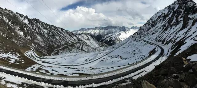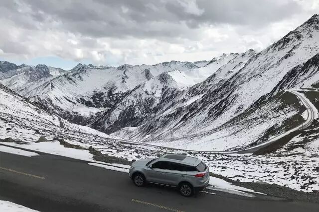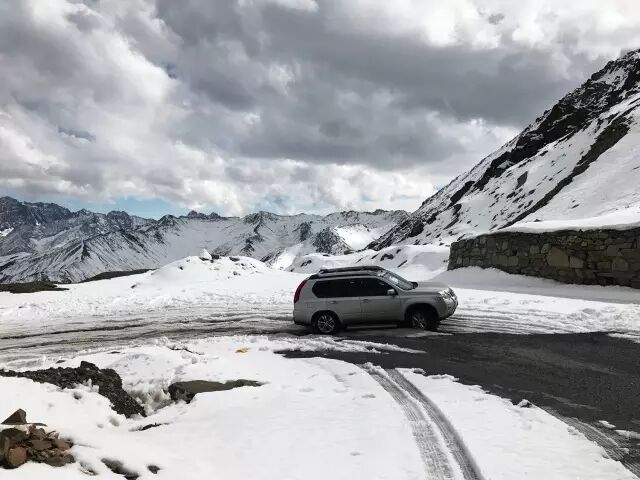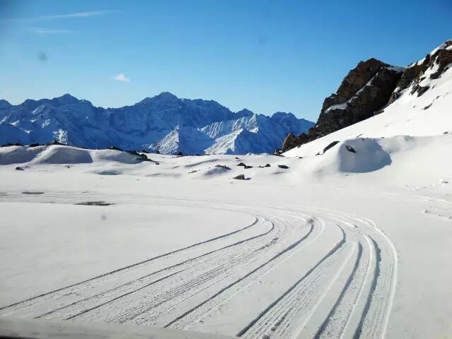 与美景相携而来的,是随着山路的攀登,路况变得尤其复杂难行——冰雪又厚又硬,山路蜿蜒多陡坡、急弯,再加上原生路况与上下错车狭窄,前行都变得十分危险。
