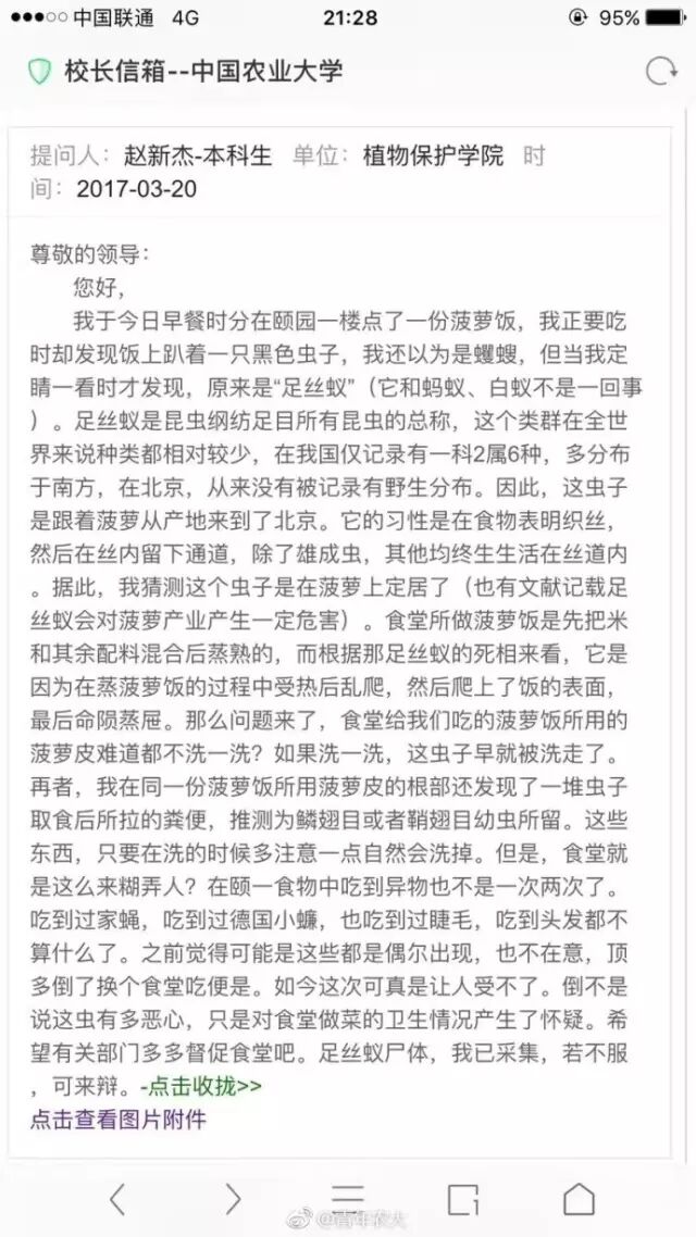 据农大学生微博社团@青年农大 消息,该校植物保护学院本科生赵同学因在学校食堂吃饭时发现一只虫子,反感之余,他写信将此事反映给了校长。