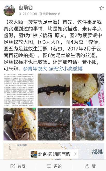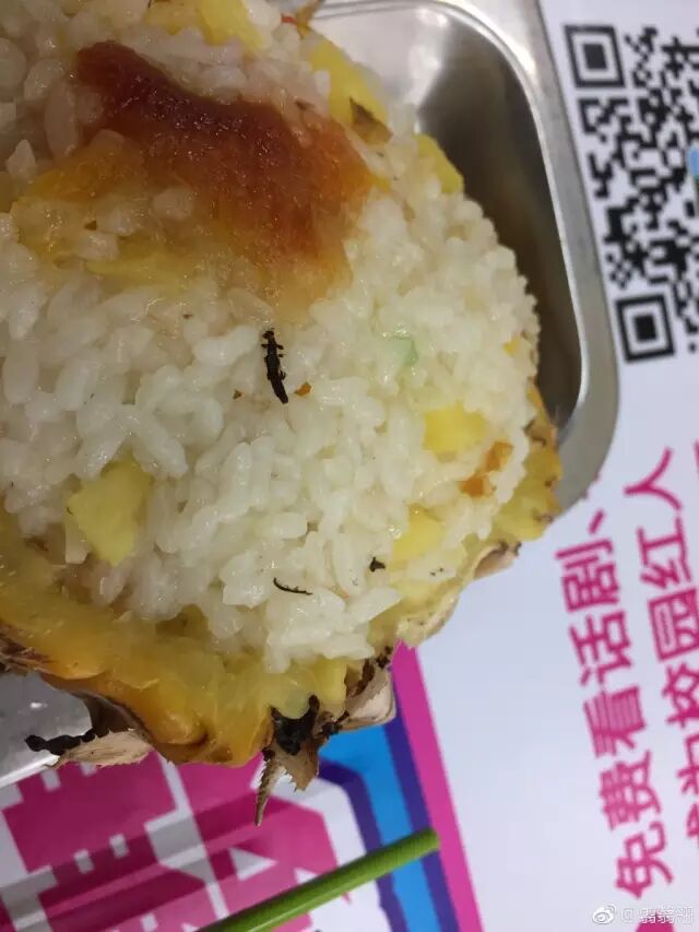 “那么问题来了,食堂给我吃的菠萝饭所用的菠萝皮难道都不洗一洗?如果一洗,这虫子早就被洗走了。”