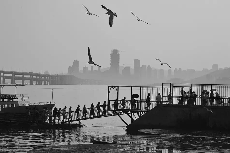 鸟儿飞过的时候,他们也回来了,城市在暮色中渐渐隐去,泊船后的渡口依旧井然,站在远处定格此刻的惬意与自然,才发现暮归的海边有一份独特的诗意盎然。