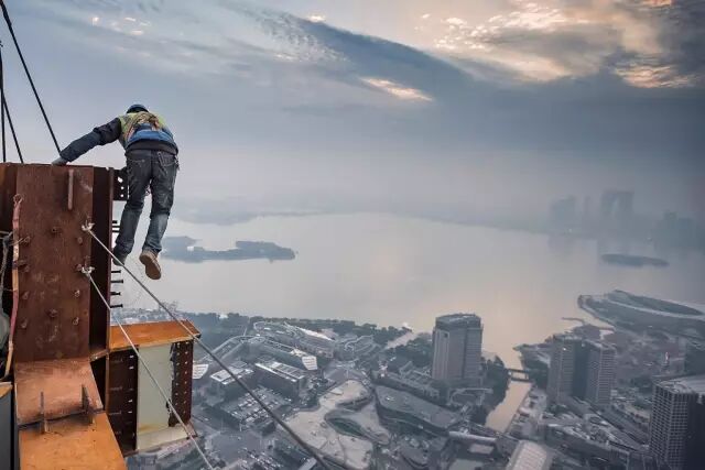 钢构起重安装工,肩负着大厦建设的重要任务。一名合格的起重安装工,要具备过硬的身体素质和心理素质,首先要胆大心细,不恐高,超高处悬空作业如履平地,其 次还要有娴熟的操作技能,同时还要具备精益求精的共建精神和职业道德。图为起重吊装师傅越过300多米高的外框柱,准备迎接即将吊装到位的外框梁。他想在 天黑之前完成该处吊装。赵培根 摄