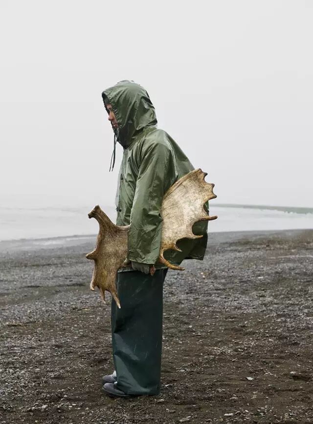 拿着驼鹿鹿角的水手。偏远的捕鲑鱼营地,布里斯托湾,阿拉斯加。
