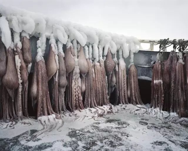 许多章鱼被吊在捕鳕鱼船的栏杆上冻结成冰。这些章鱼将被剁成小块作为鱼饵。