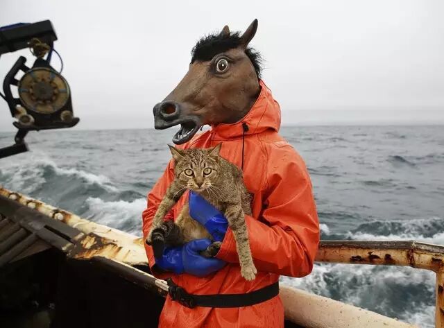 马修·沙利文,在罗洛号渔船上试万圣节装扮时与船上住的猫咪合影。
