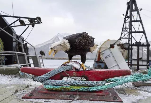 白头雕吃着从渔网中偷来的鳕鱼