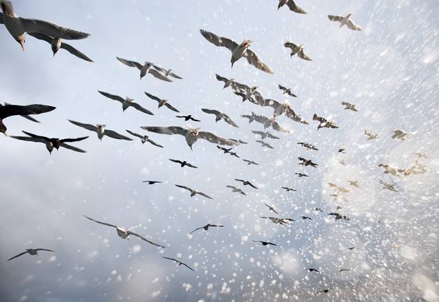 海鸟追随着我们的渔船,寻找散落的饵料残渣。