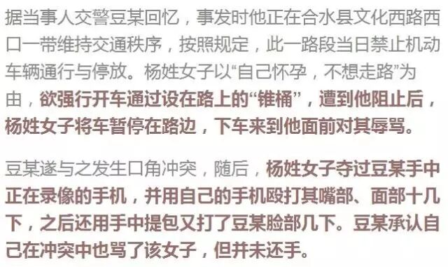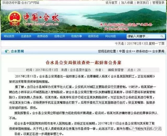昨天,合水县委外宣办回应称,经讯问,杨某对其涉嫌妨害公务的犯罪事实供认不讳。目前,犯罪嫌疑人杨某(合水县某医院职工,正在妊娠期)被依法采取取保候审强制措施。