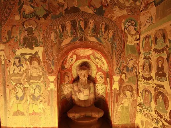 莫高窟是一座融绘画、雕塑和建筑艺术于一体,以壁画为主、塑像为辅的大型石窟。莫高窟壁画绘于洞窟的四壁、窟顶和佛龛内,内容博大精深,主要有佛像、故事、史迹、经变、神怪、供养人、装饰图案等七类题材,此外还有很多表现当时狩猎、耕作、纺织、交通、战争、建设、舞蹈、婚丧嫁娶等社会生活各方面的画作。这些画有的雄浑宽广,有的瑰丽华艳,体现了不同时期的艺术风格和特色。如果仔细品味这些壁画,就仿佛进入一个时空的隧道,每个朝代的生活习俗、艺术造诣都历历在目。随着朝代的更迭,工匠们不同的画风都在这里留下了历史的见证。