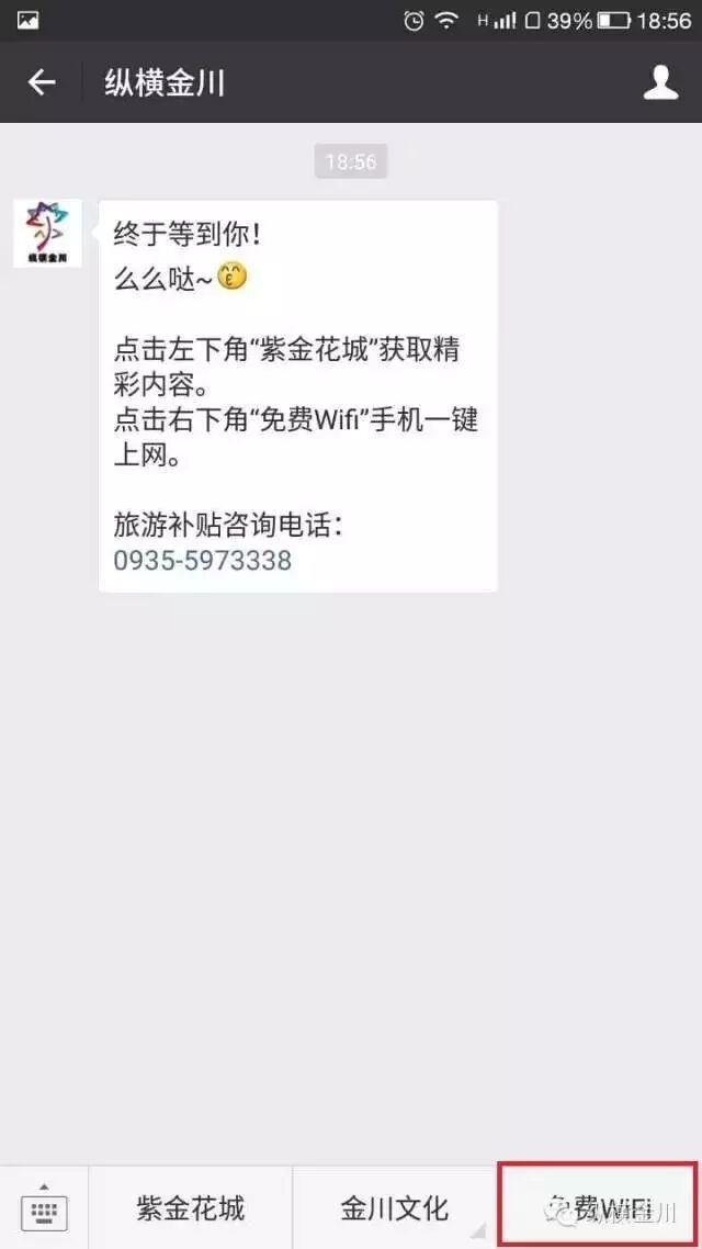 关注成功后,如图点击右下角【免费Wifi】,即可一键连接免费上网!就是这么简单!